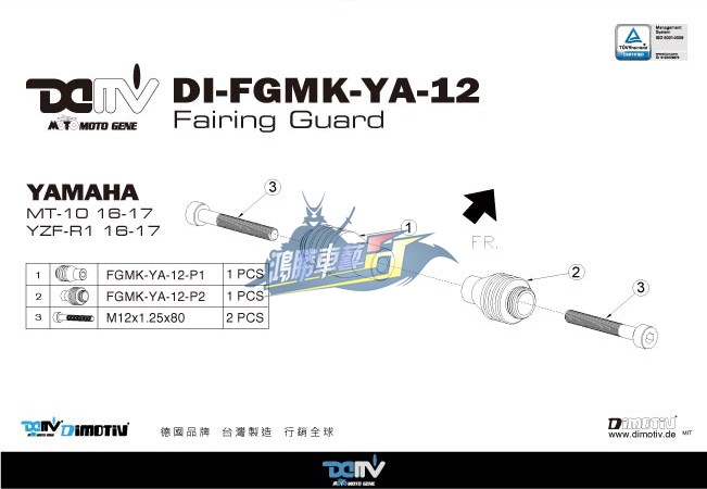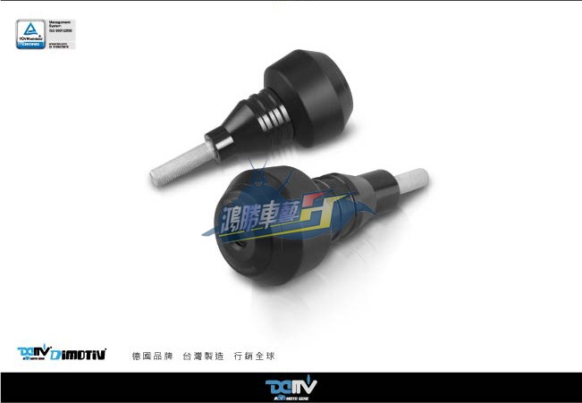 產品料號 : DI-FGMK-YA-12-E 產品名稱: Easy II 車身防倒球 產品特色及功能說明 : DIMOTV Easy II 車身防倒球組,由聚甲醛製成的塑鋼複合材質(POM)球體,與6061-T6鋁鎂合金製成的底座結 合而成,其產品特色如下: 1. 完整車架防護 特殊潰縮設計的鋁鎂合金底座,當倒車/摔車力道過大時,底座將會先行彎曲/斷裂,避免造成車體骨架/鎖點更大損傷。 2. 簡易裝卸設計 各系列防倒球組增加彈性油封設計,減少因車體震動所導致的球體鬆脫或卡死。 3. 防鏽處理 螺絲使用歐系車款專用的達可鏽防鏽技術,防止生鏽造成拆卸困難,同時維持部品美觀。 6. 陽極表面處理 與高階手機同等級的陽極上色處理,提供產品更多樣的選擇,以更持久、高質感的色彩點綴您的愛車。 4. 歐盟最高規範 符合德國萊茵(TUV)歐盟R2設計標準,降低商品因意外 而產生對騎士或行人的額外傷害。 5. 延長產品壽命 車身防倒球組各系列產品部件,均可購入修補零件替換,維持產品正常功能與整體美觀。