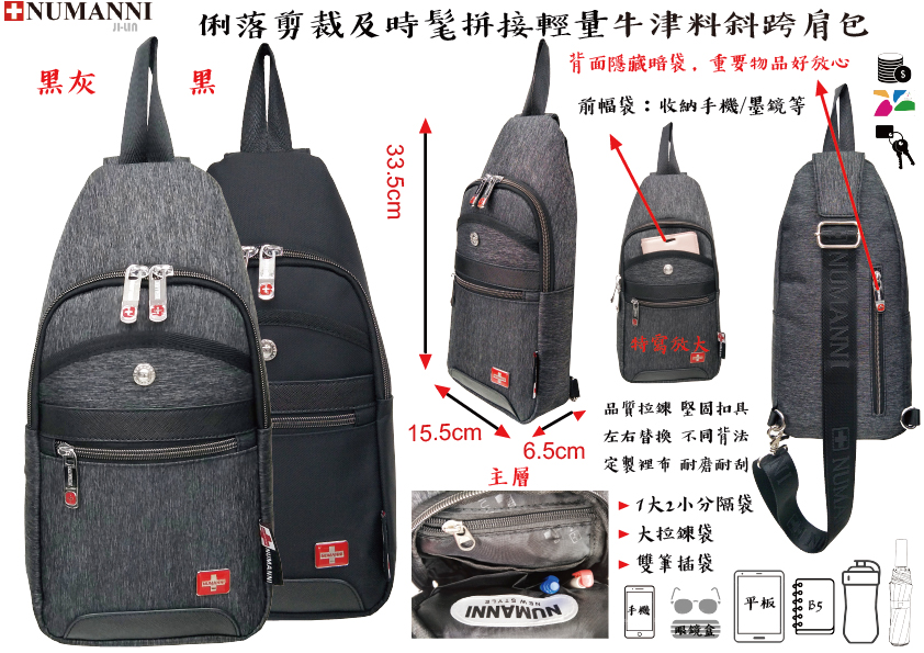 25-8854C【NUMANNI 奴曼尼】俐落剪裁及時髦拼接輕量牛津料斜跨肩包 (二色)