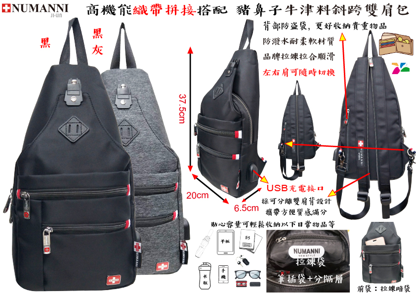25-8879D【NUMANNI 奴曼尼】高機能織帶拼接搭配 豬鼻子牛津料斜跨雙肩包 (二色)