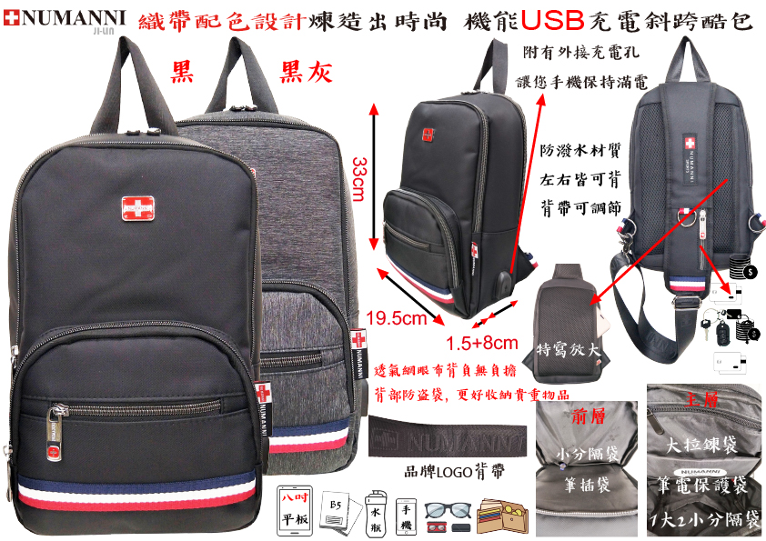 78-8018B【NUMANNI 奴曼尼】織帶配色設計煉造出時尚 機能USB充電斜跨酷包 (二色)