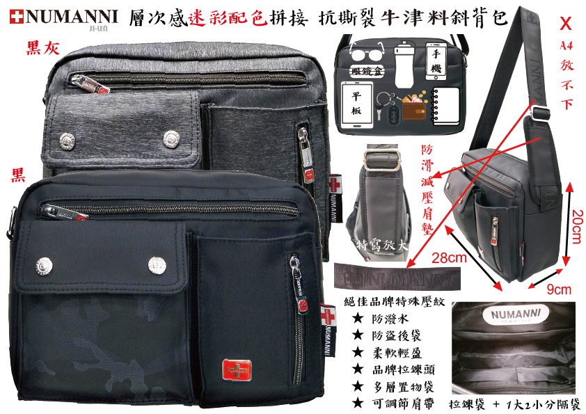 78-8027B【NUMANNI 奴曼尼】層次感迷彩配色拼接 抗撕裂牛津料斜背包 (二色)