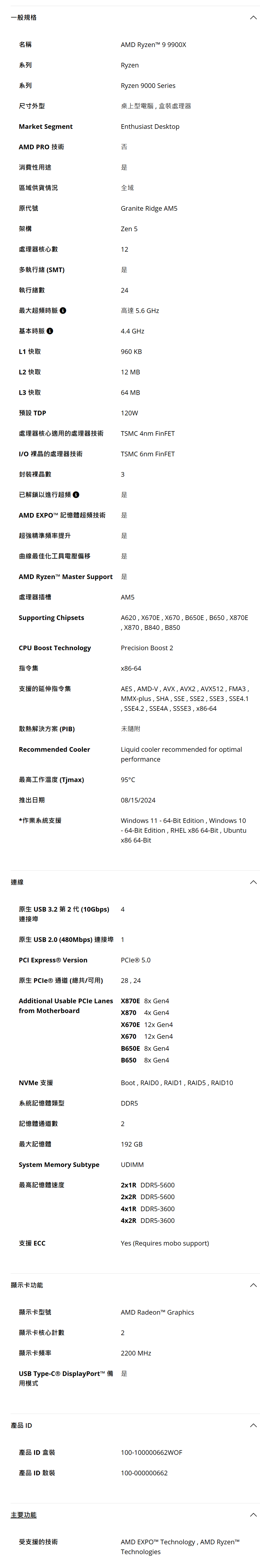 AMD Ryzen 9 9900X【12核/24緒】AM5/含內顯/無風扇/中央處理器 0