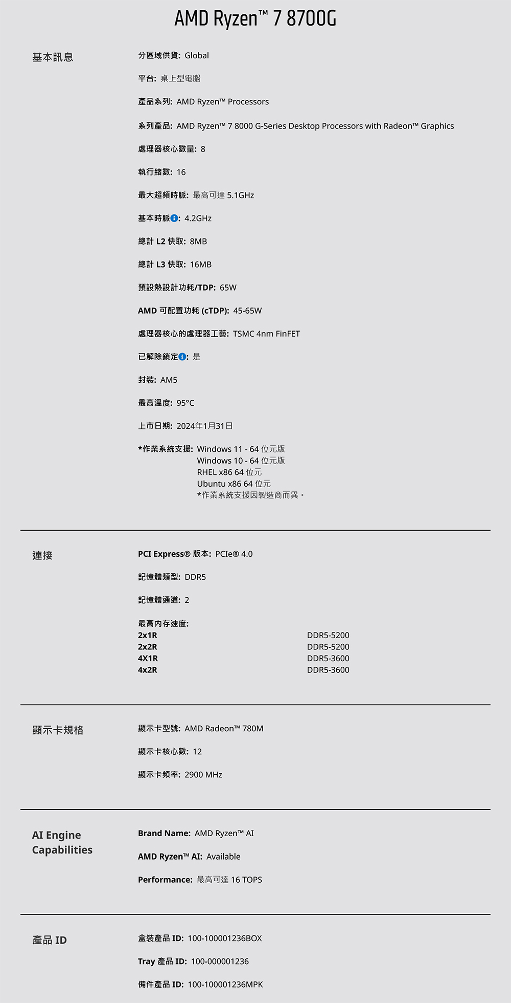 AMD Ryzen 7 8700G R7-8700G 8核16緒 盒裝中央處理器 0
