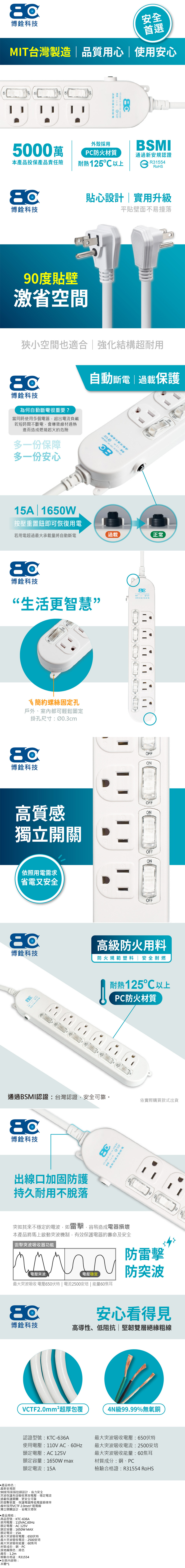 BC 博銓 KTC-636A-6 6切6座3孔1.2M/6尺 防雷擊 延長線(過載斷電保護/固定掛孔)