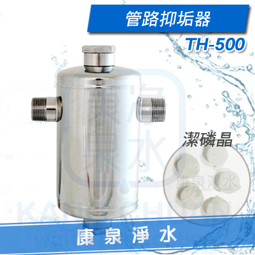 ※商品規格: ● 型號:TH-500 ● 商品材質:外殼使用304不鏽鋼材質(內含 50 顆潔磷晶) ● 使用濃度:1 ~ 5 ppm ● 用水量:1 ~ 5.5 噸 / 天 ● 環境溫度:5°C ~ 40°C ● 適用管徑:3/4” ● 適用環境:日用水量超過1噸(約4人以上家庭)、太陽能熱水器前最適用