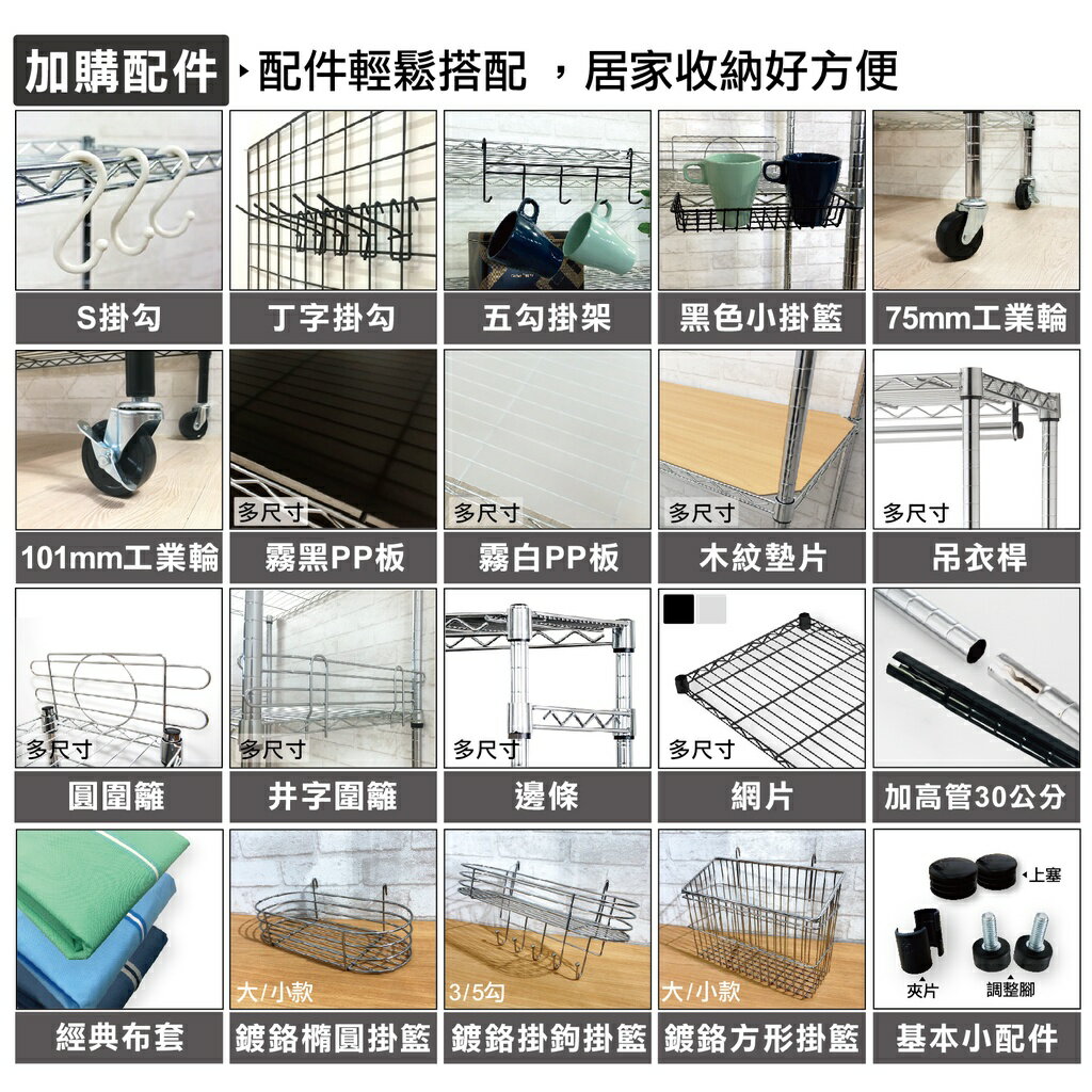 可另外加購霧白/黑棕PP墊片、木紋墊片、工業輪、邊條、圍籬等相關周邊配件,讓您的鐵架更百變、更美觀、更多功能哦!快來DIY專屬您的鐵架吧!