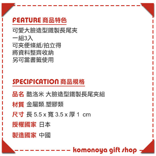 小禮堂 酷洛米 大臉造型鐵製長尾夾組《3入.黑白》燕尾夾.夾子