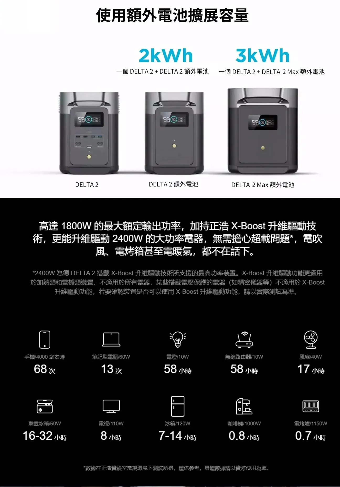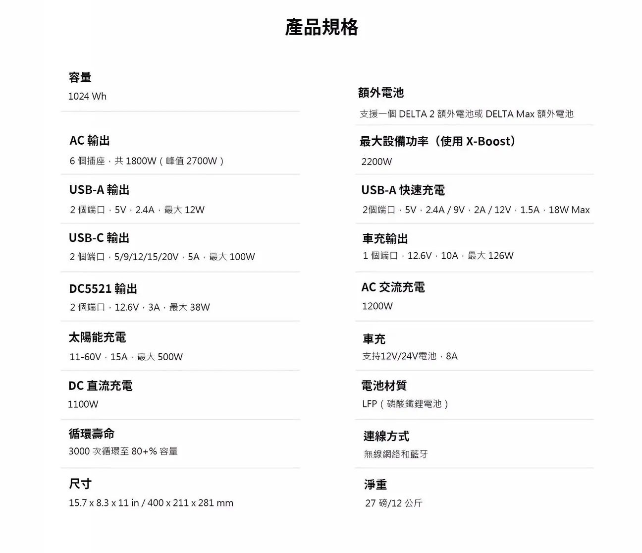 • 電池容量,搭配額外電池以達到2048Wh   DELTA 21024W