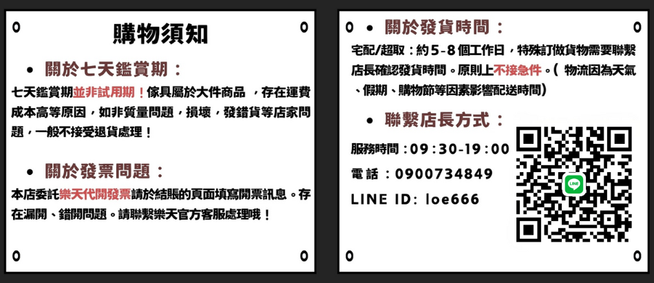 | 服務時間 : 週一至週五 09:00~12:00 13:00~17:00 *休假日及國定假日不上班* | 客服電話 : 0900734849 | 客服信箱 : ydu80935@gmail.com | 店長line:loe666