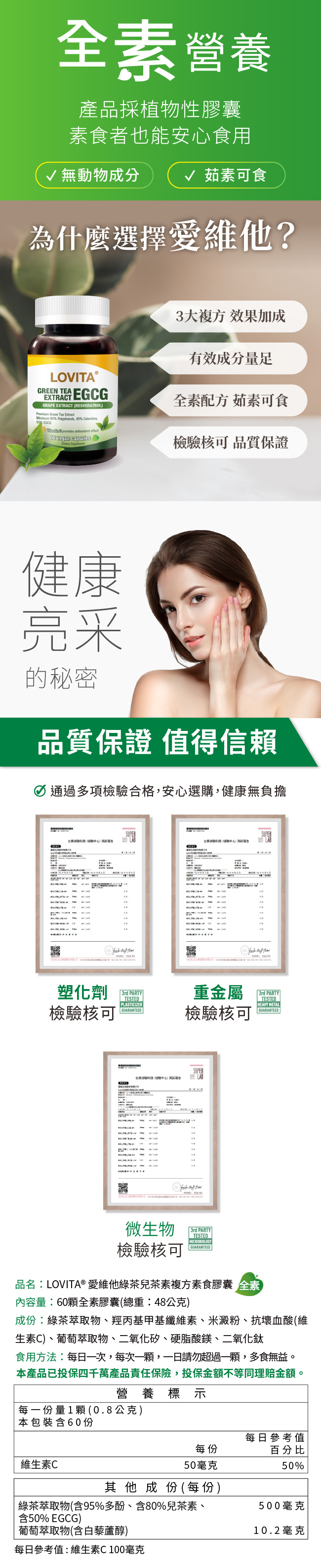 品名:LOVITA 愛維他 綠茶EGCG 葡萄萃取白藜蘆醇素食膠囊