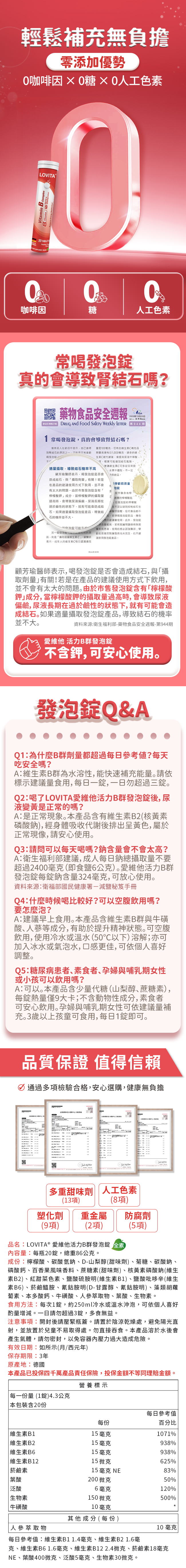 成分:檸檬酸、碳酸氫鈉、D-山梨醇(甜味劑)、菊糖、碳酸鈉、磷酸鈣、百香果風味香料、蔗糖素(甜味劑)、核黃素磷酸鈉(維生素B2)、紅甜菜色素、鹽酸硫胺明(維生素B1)、鹽酸吡哆辛(維生素B6)、菸鹼醯胺、氰鈷胺明(D-甘露醇、氰鈷胺明)、藻類胡蘿蔔素、本多酸鈣、牛磺酸、人參萃取物、葉酸、生物素。
