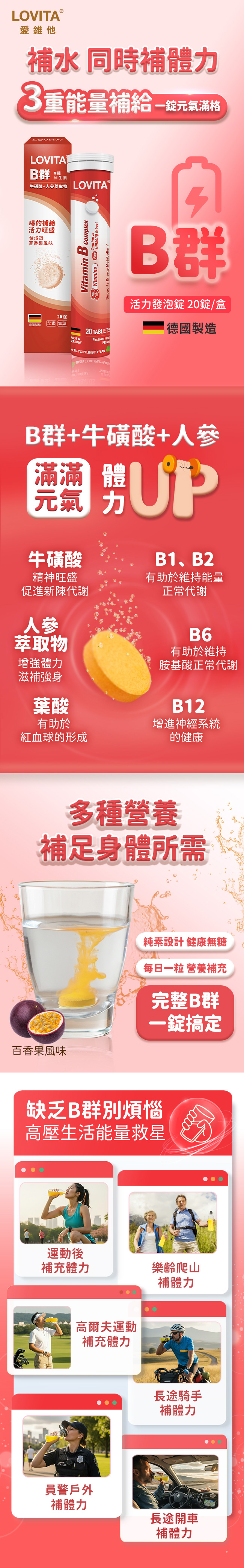 【LOVITA 愛維他】活力B群發泡錠 6入組 20錠(百香果風味 牛磺酸 人參 無咖啡因 全素 德國進口)