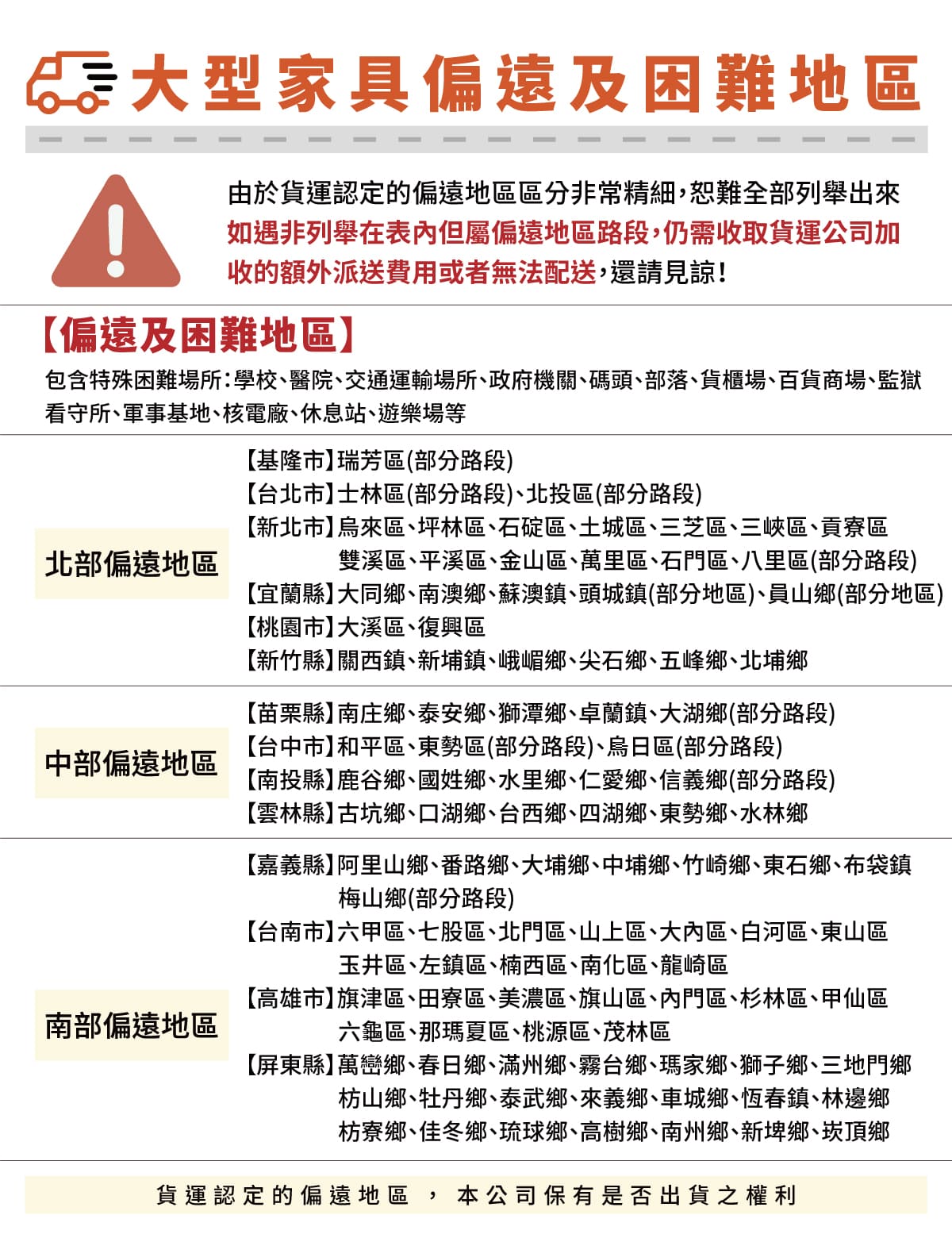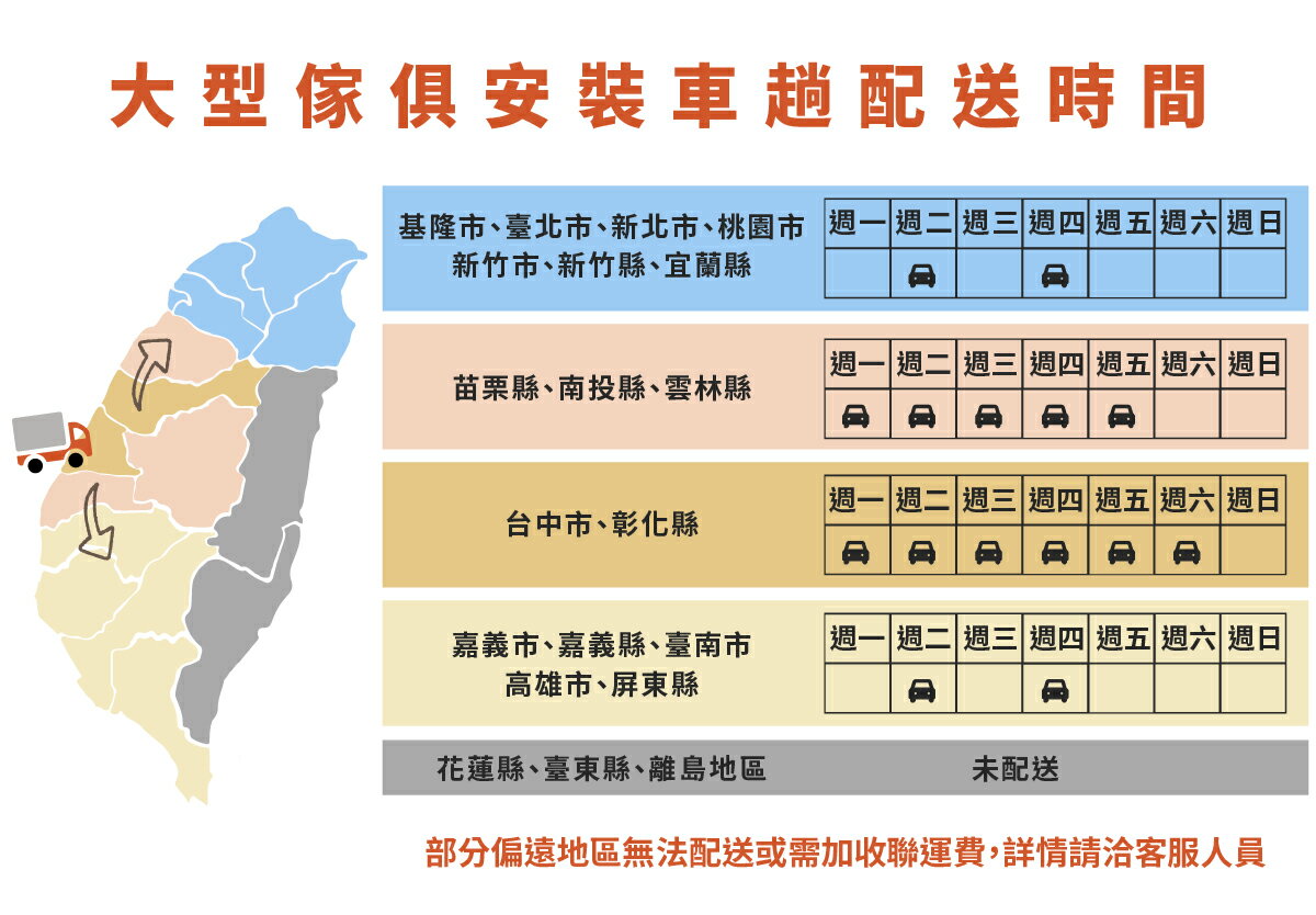 - 大型傢俱:免費組裝定位『但需配合貨運公司時間』,可依各縣市車趟日指定配送日期,無法指定抵達時間。