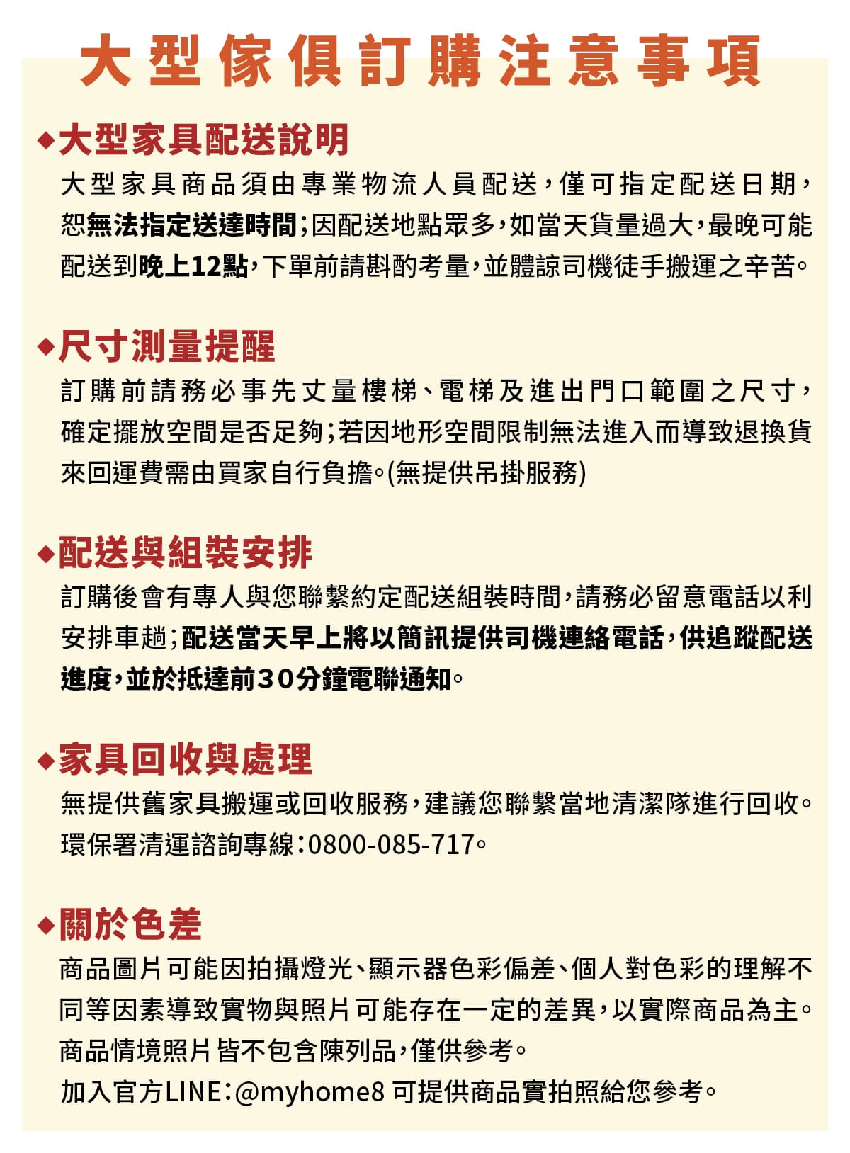 大型傢俱訂單-客服會於上班日,電聯確認配送日期。