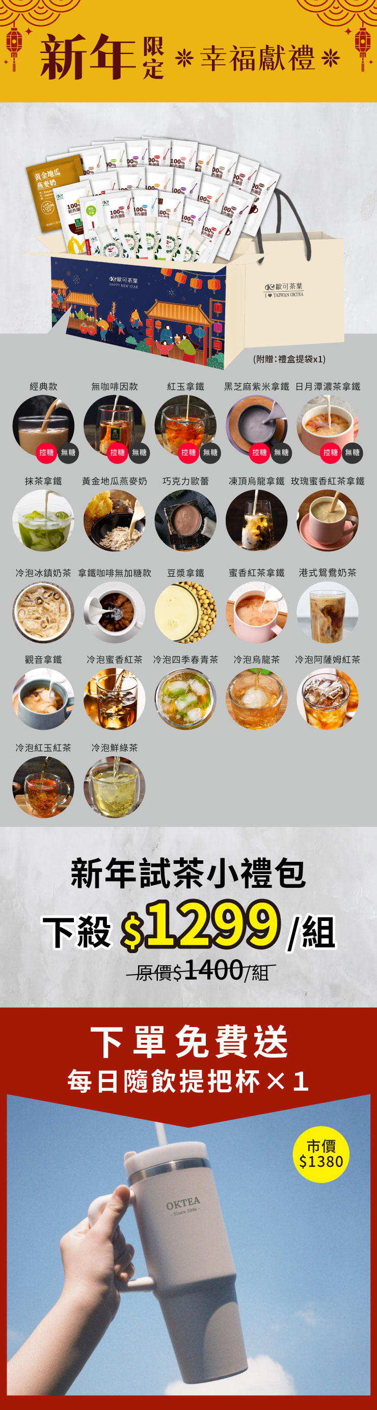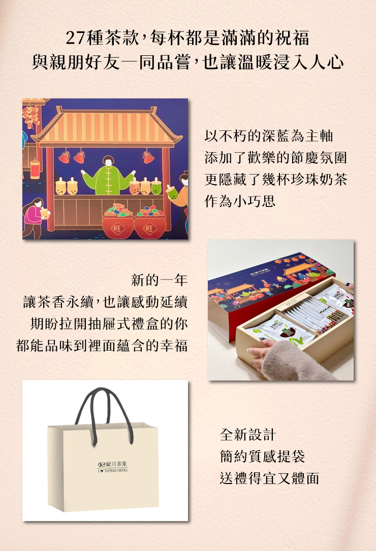 新的一年讓茶香永續,也讓感動延續。 送禮首選🎁 洋溢著祝福的新年限定 27件試茶福箱精裝款 🌟跳脫傳統,我們採用更加質感的配色 🌟溫暖地展現過年的熱鬧氛圍 🌟隱藏了幾杯珍珠奶茶於其間 🌟抽屜式設計,拉開清楚展現 🌟可一次體驗21款真奶茶+6款冷泡茶 希望收到這份禮物的人,都能擁有嶄新又美好的一年。 泡杯茶,與重要的他一起分享吧! 🎁只要下單:新年限定27件試茶福箱精裝款 🎁立即贈送:每日隨飲提把保溫杯880mlx1(市價$1380) 🎁加碼再送:禮盒提袋x1 🧧整組原價:$1400➔新年限定價$1299 ✨每日隨飲提把保溫杯880mlx1✨ ■304不鏽鋼安心喝 ■三位旋轉防塵杯蓋 ■杯身提把容易攜帶 ■附贈吸管方便飲用 ■880ml大容量設計
