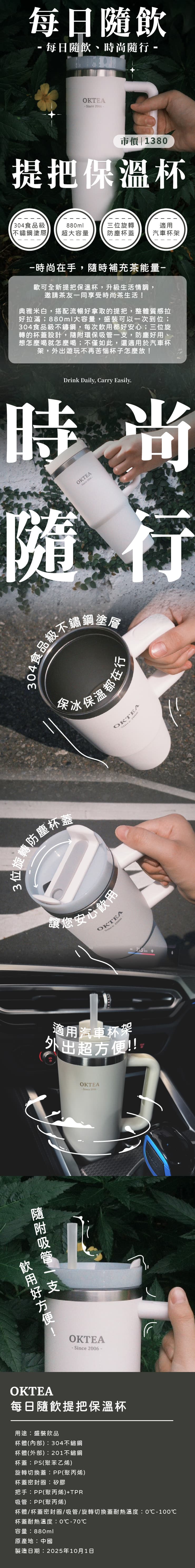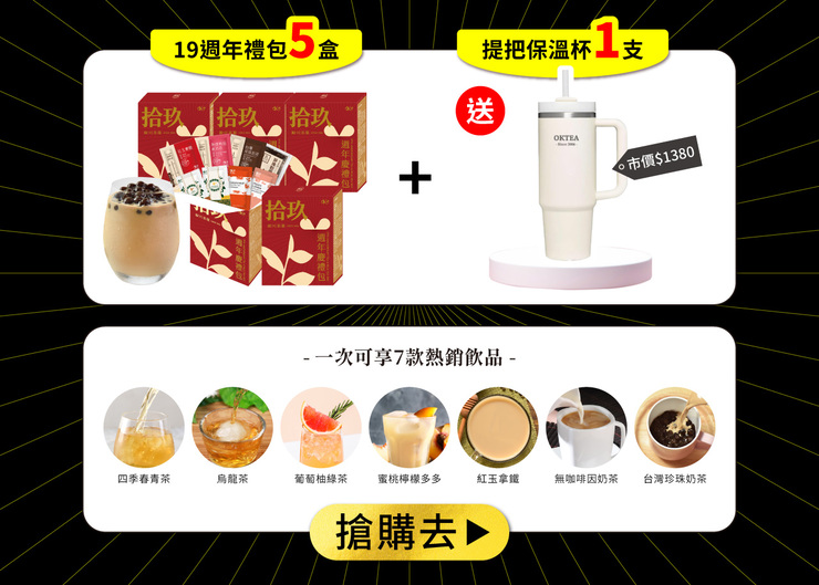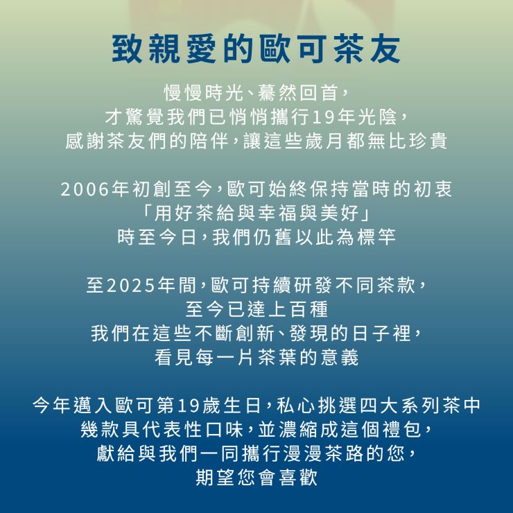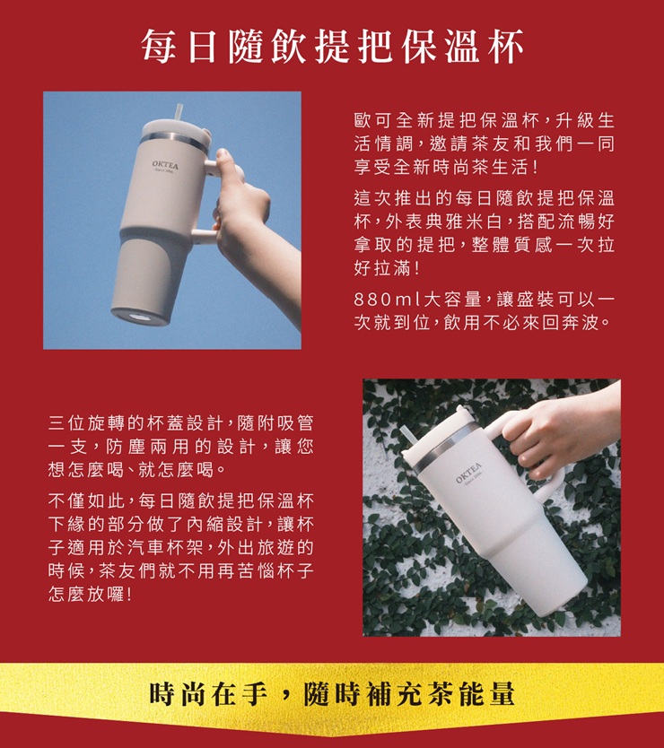 每一包茶葉背後,都有一段茶友與歐可的故事 在這19年裡,感謝每一位陪伴我們的茶友 是你們讓歐可不斷成長與創新! 為了慶祝19週年,阿倫挑選了幾款經典的口味 組成【19週年限定綜合禮包】要分享給你們喔❤️ 🎉一盒內含: 𝗔 冷泡茶系列 ❶冷泡茶 烏龍茶x1包 ❷冷泡茶 四季春青茶x1包 𝗕 水果茶系列 ❸蜜桃檸檬多多x1包 ❹葡萄柚綠茶x1包 𝗖 真奶茶系列 ❺紅玉拿鐵x1包 ❻無咖啡因奶茶x1包 𝗗 珍珠奶茶系列 ❼ 台灣珍珠奶茶x1包(含珍珠粉圓x1包) 阿倫最推一次預購5盒👍 因為今天可以帶走贈品:每日隨飲提把保溫杯880mlx1(市價$1380)💕 ✨每日隨飲提把保溫杯880mlx1✨ ■880ml大容量設計 ■附贈吸管方便飲用 ■杯身提把容易攜帶 ■三位旋轉防塵杯蓋 ■304不鏽鋼安心喝