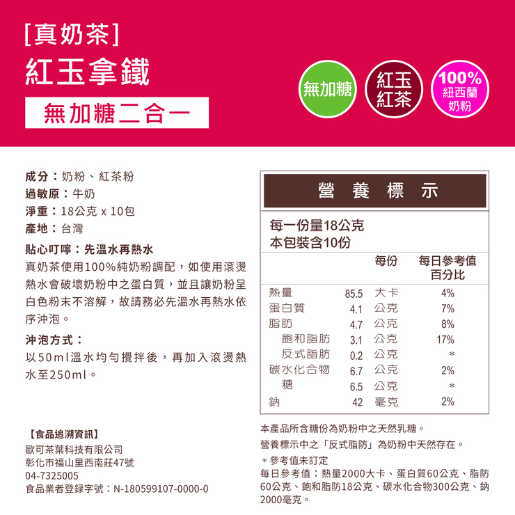 最純粹的紅玉紅茶,配上100%紐西蘭奶粉,這杯真奶茶就算不加糖還是一樣好喝,來自歐可茶葉!