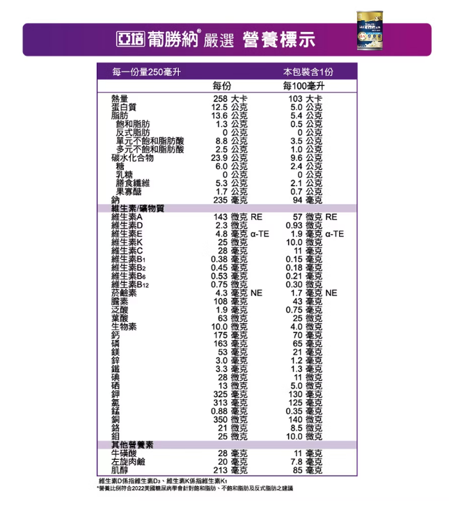 【成分】水.麥芽糊精.濃縮牛奶蛋白.高油酸葵花籽油.麥芽糖醇(甜味劑).分離大豆蛋白.難消化性麥芽糊精.果寡醣.黃豆纖維.菜籽油.檸檬酸鈉.香料.大豆卵磷脂.氯化鉀.氯化鎂.肌醇.檸檬酸鉀.磷酸氫二鉀.鹿角菜膠.氯化膽 .維生素C.葡萄糖.牛磺酸.硫酸亞鐵.氫氧化鉀.硫酸鋅.葵花籽油.硫酸錳.菸鹼醯胺.硫酸銅.維生素E.本多酸鈣.維生素B6.維生素B1.維生素A棕櫚酸酯.維生素B2.葉酸.三氯化鉻.碘化鉀.鉬酸鈉.維生素K1.硒酸鈉.生物素.維生素D3.維生素B12