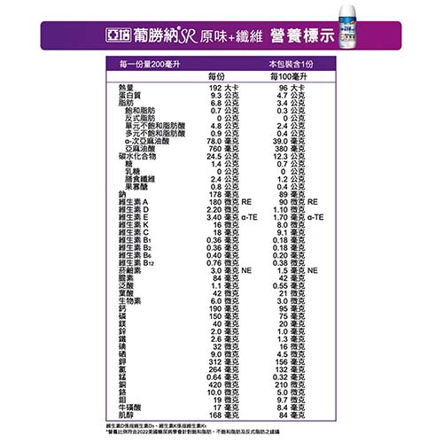 葡勝納SR原味加纖維 糖尿病專用營養品,熱量易計算且方便使用於糖尿病飲食管理。是亞培營養科學家精心研發的六大嚴選營養管理:鉻,難消化性麥芽糊精,黃豆纖維,果寡醣,零膽固醇,零反式脂肪之優異組合,且不含乳糖,營養管理健康無負擔。原味加纖維,適合不喜甜食者。 提供鉻幫助醣類正常代謝。 含有維生素B1,幫助維持心臟的正常功能。 添加膳食纖維(果寡醣,黃豆纖維) 。 幫助維持消化道機能。 促進新陳代謝。