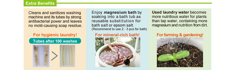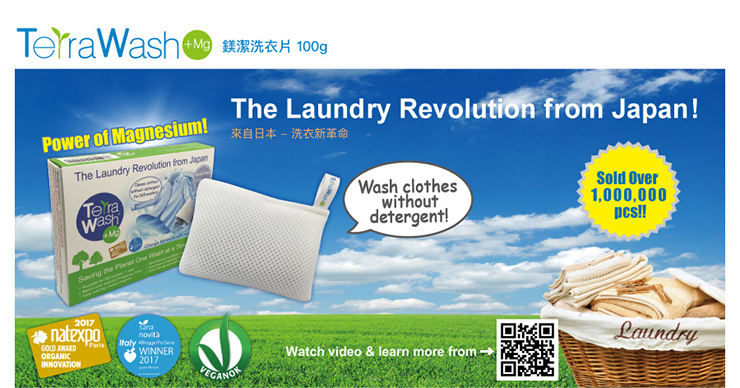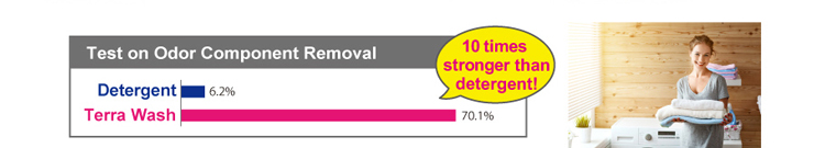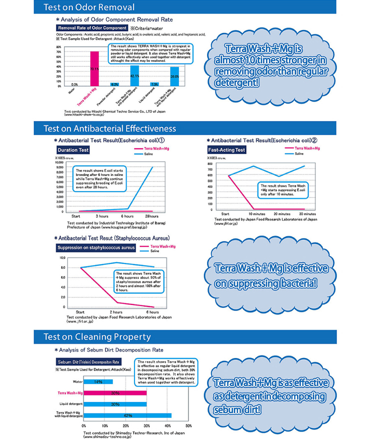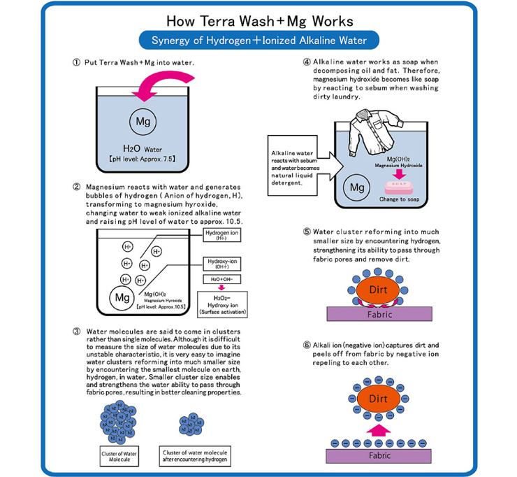 Terra Wash+Mg 運作原理? Terra Wash+Mg 產品了由 99.95% 高純度的鎂構成,採用日本創新專利技術特別加工。當這種特殊的鎂與水接觸時,它產生氫氣氣泡並形成 pH 值約 10.5 的離子化鹼性水,這使得從織物上除去污垢變得更容易。這種特殊的水有很高的能力去除污垢、皮脂、黴菌、細菌及其氣味,讓衣物洗乾淨! Terra Wash+Mg 的另一個特點是它能夠減少水分子的大小,讓水分子更容易通過織物孔隙,帶來更好的清潔性能。