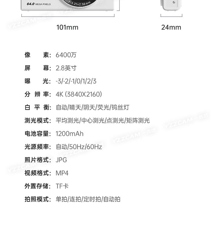像素:6400萬像素鏡頭類型:潛望式變焦類型:電子變焦變焦倍數:16倍觸摸屏:不支持翻轉屏:不支持屏幕尺寸:其他存儲介質:TF(Micro SD)卡WIFI功能:支持延時拍攝:支持遙控拍攝:不支持連拍:支持機身閃光燈:不支持外接閃光燈:不支持