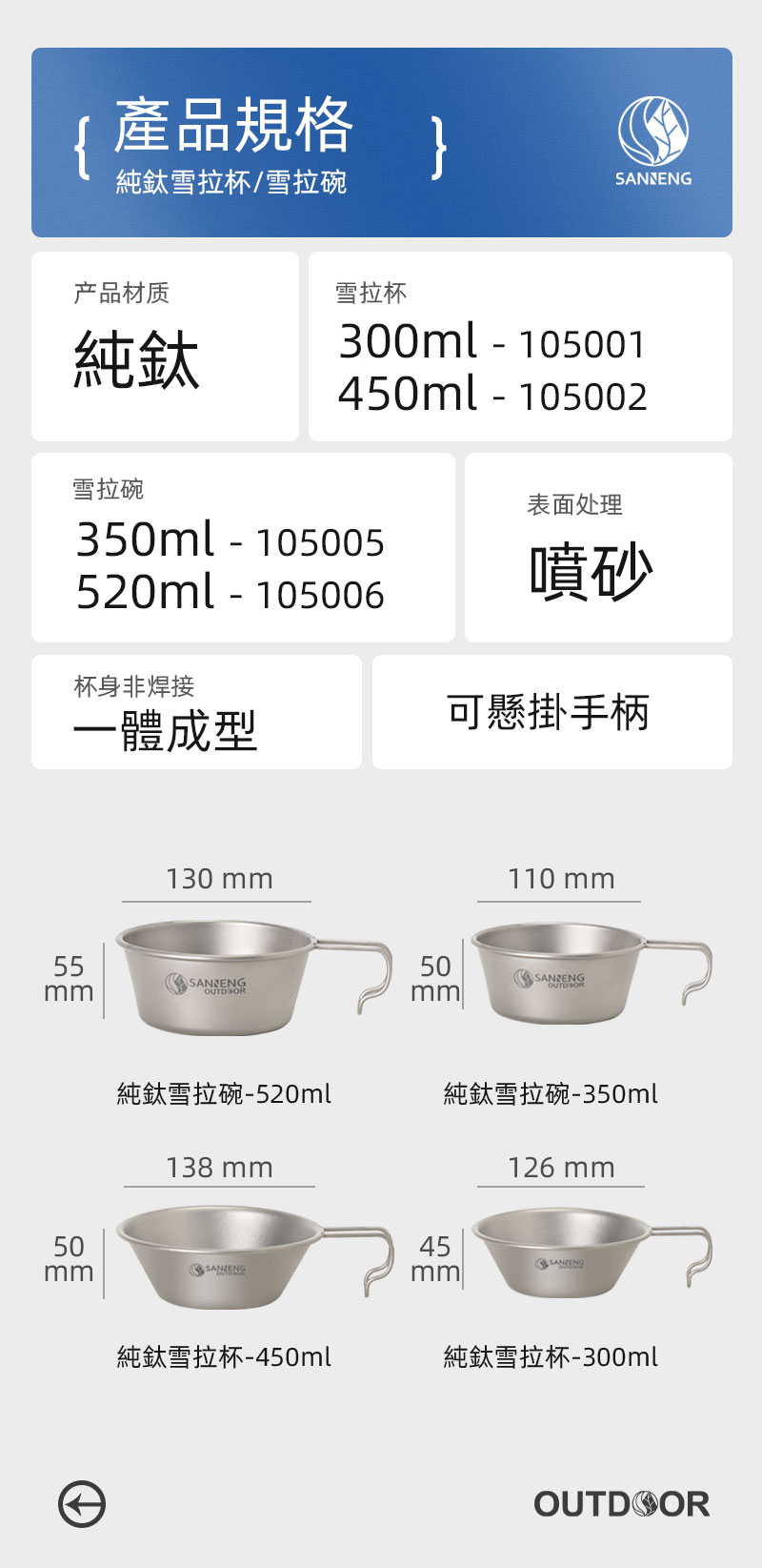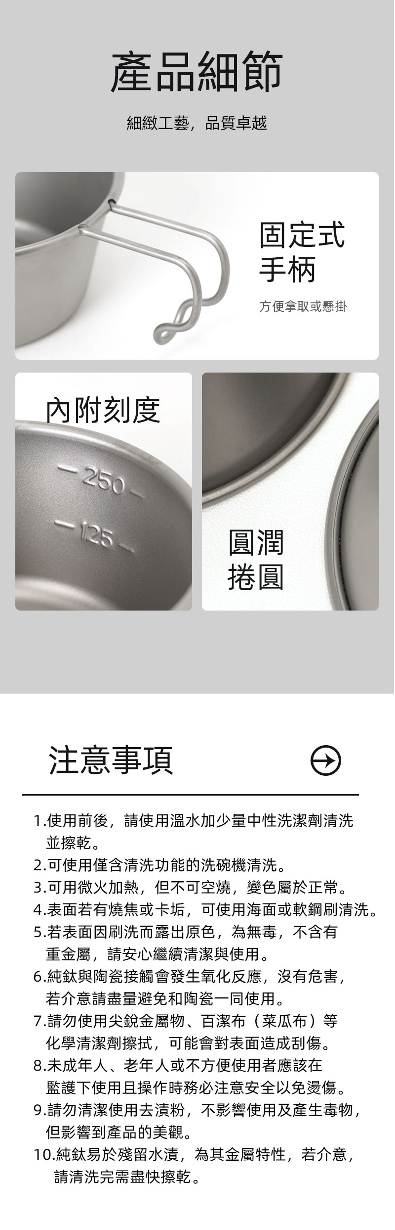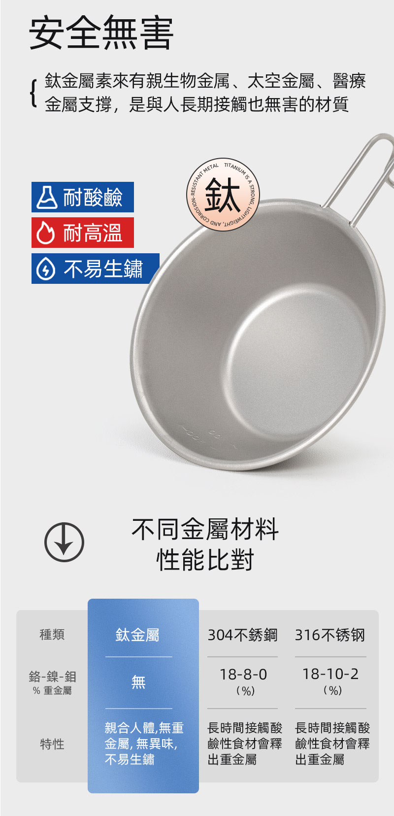 材質:純鈦 編號:105001 容量:300ml 規格:圓徑120x45mm