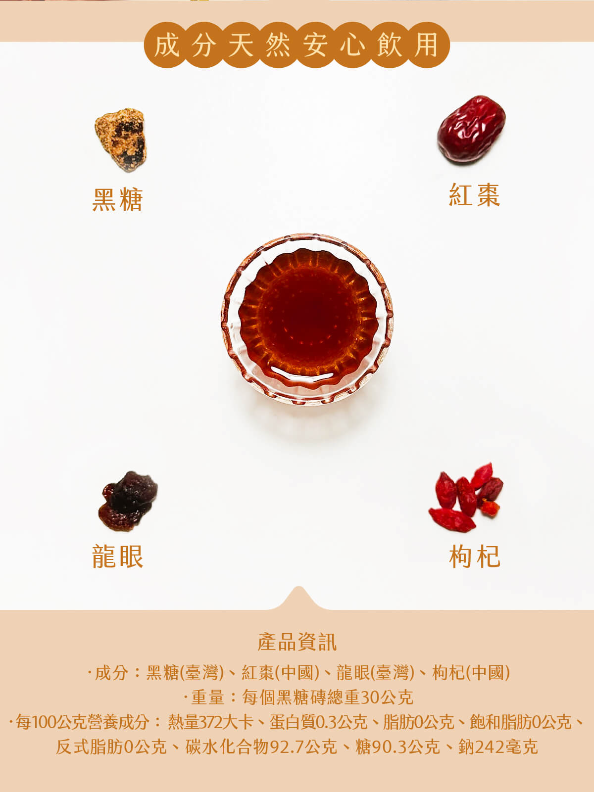 ‧成分:黑糖(臺灣)、紅棗(中國)、龍眼(臺灣)、枸杞(中國)