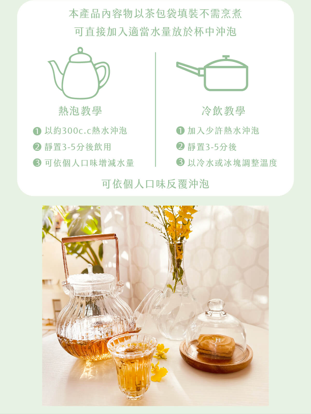 ‧本產品內容物以茶包袋填裝,不需烹煮,可直接加入適當水量放於杯中沖泡。