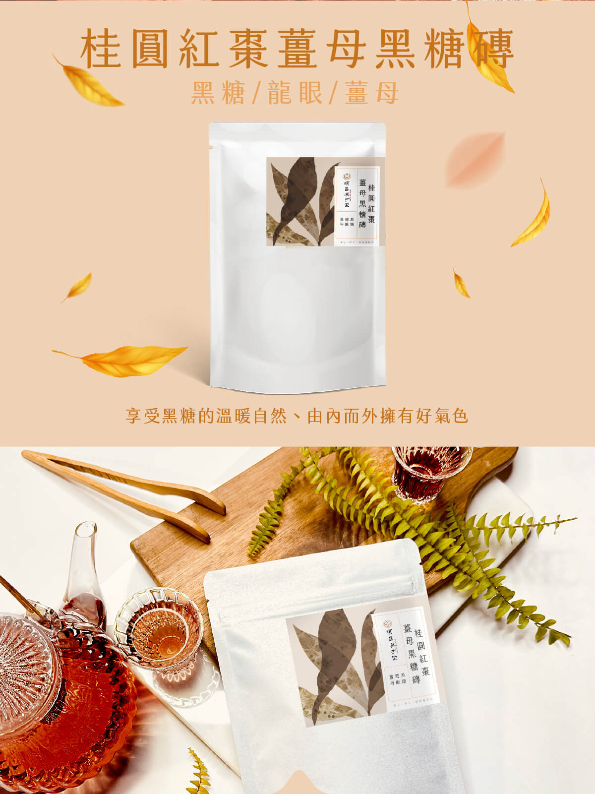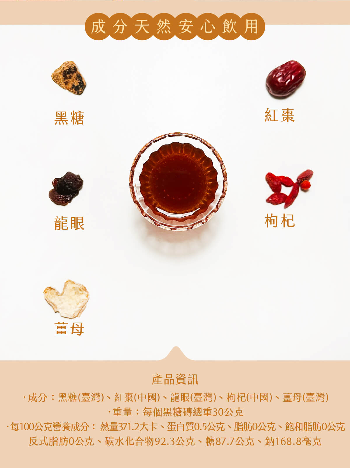 ‧成分:黑糖(臺灣)、紅棗(中國)、龍眼(臺灣)、枸杞(中國)、薑母(臺灣)