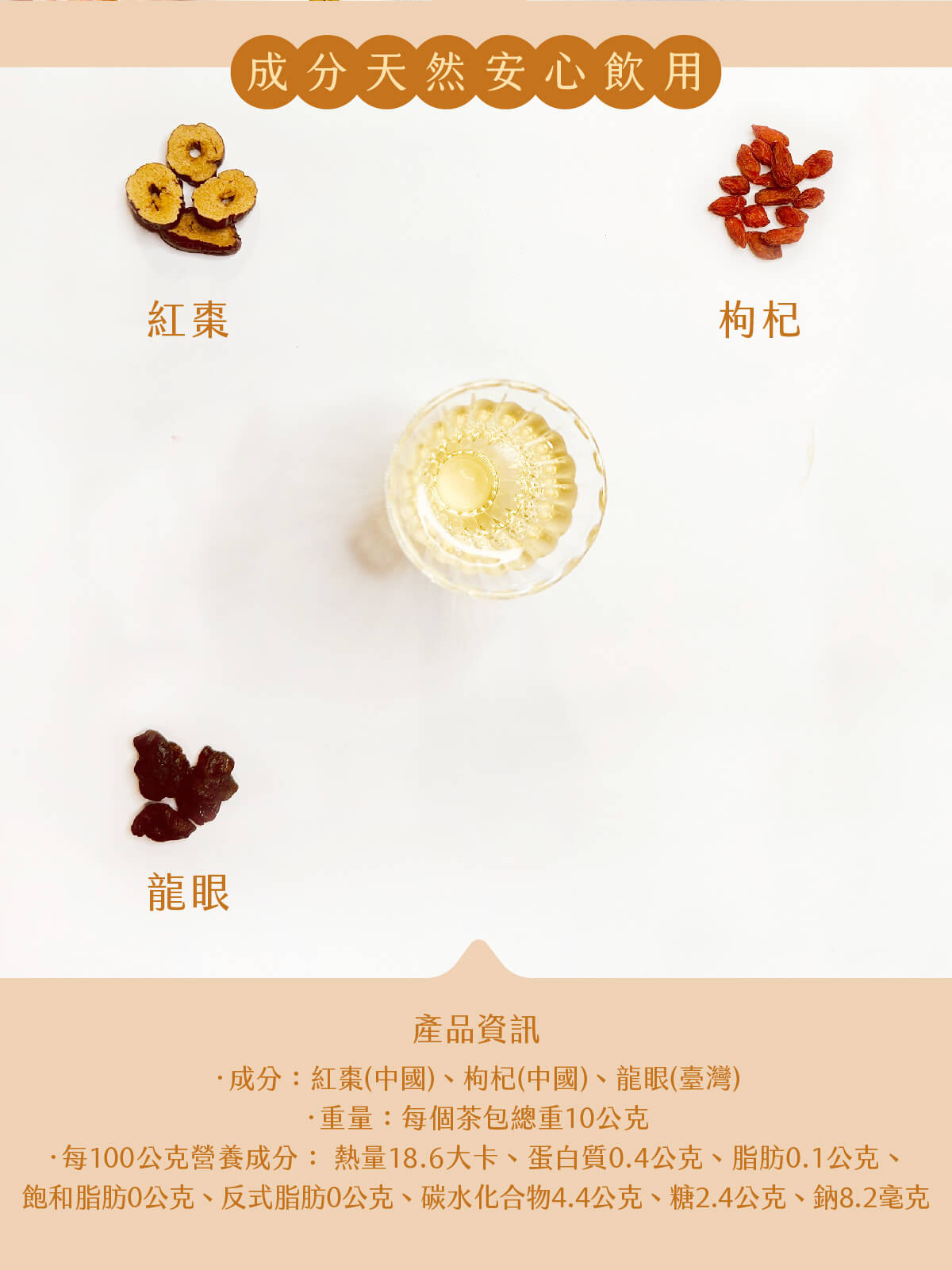 ‧成分:紅棗(中國)、枸杞(中國)、龍眼(臺灣)