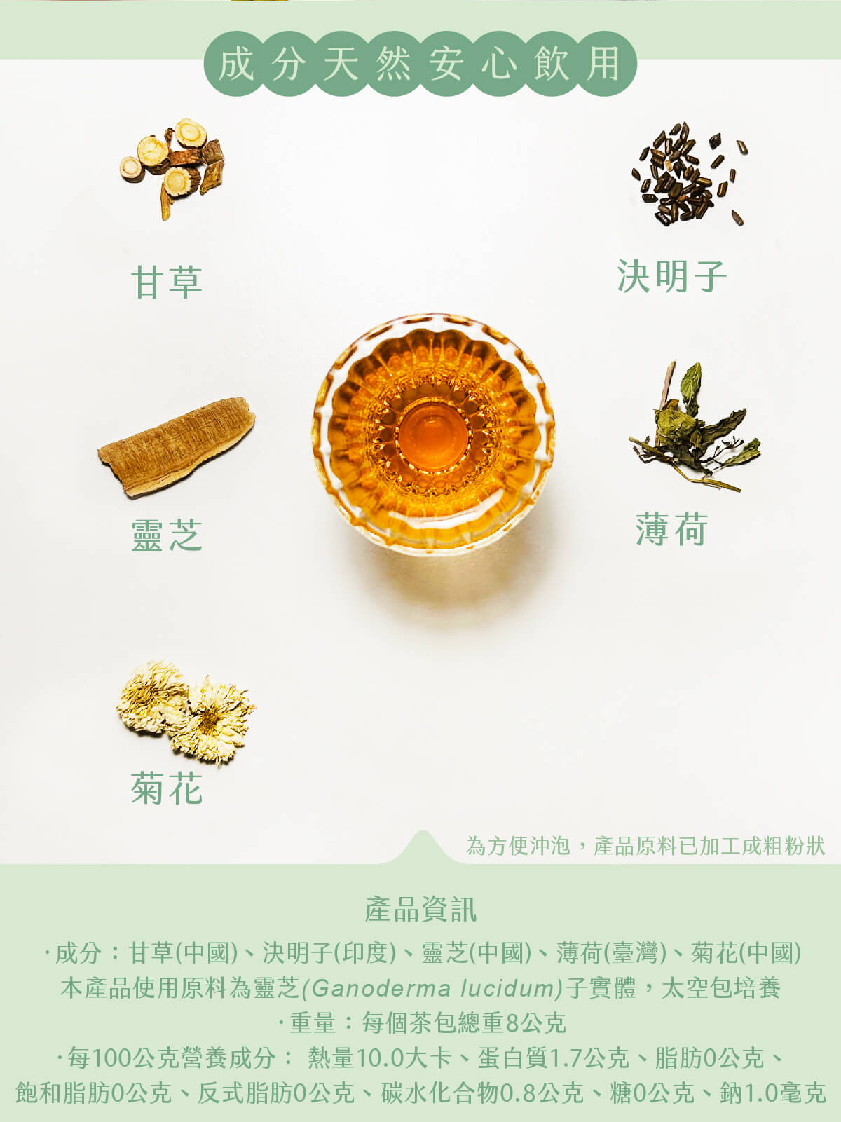 ‧成分:甘草(中國)、決明子(印度)、靈芝(中國)、薄荷(臺灣)、菊花(中國)