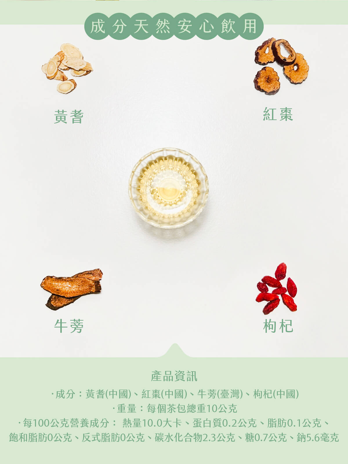‧成分:黃耆(中國)、紅棗(中國)、牛蒡(臺灣)、枸杞(中國)