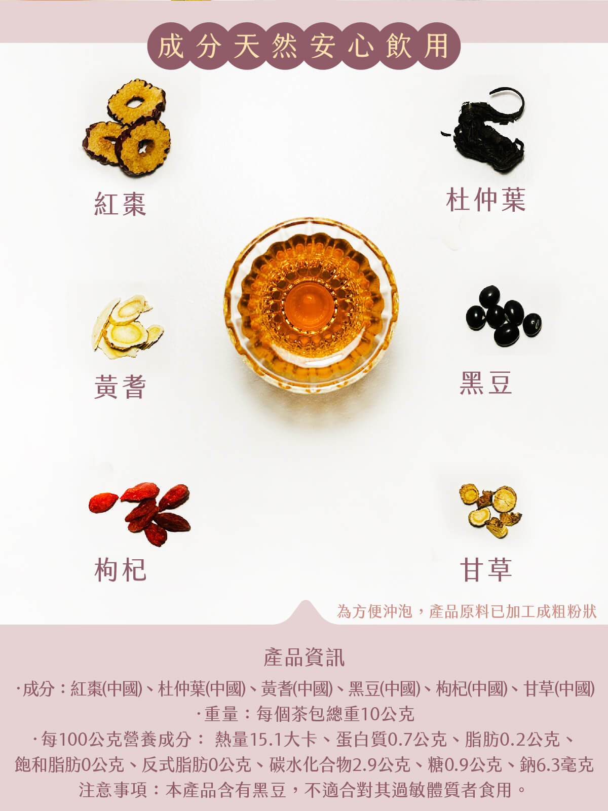‧成份:紅棗(中國)、杜仲葉(中國)、黃耆(中國)、黑豆(中國)、枸杞(中國)、甘草(中國)