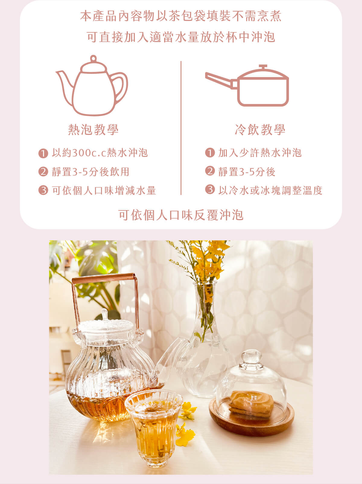 ‧加入少許熱水沖泡,靜置3-5分後,以冷水或冰塊調整溫度。
