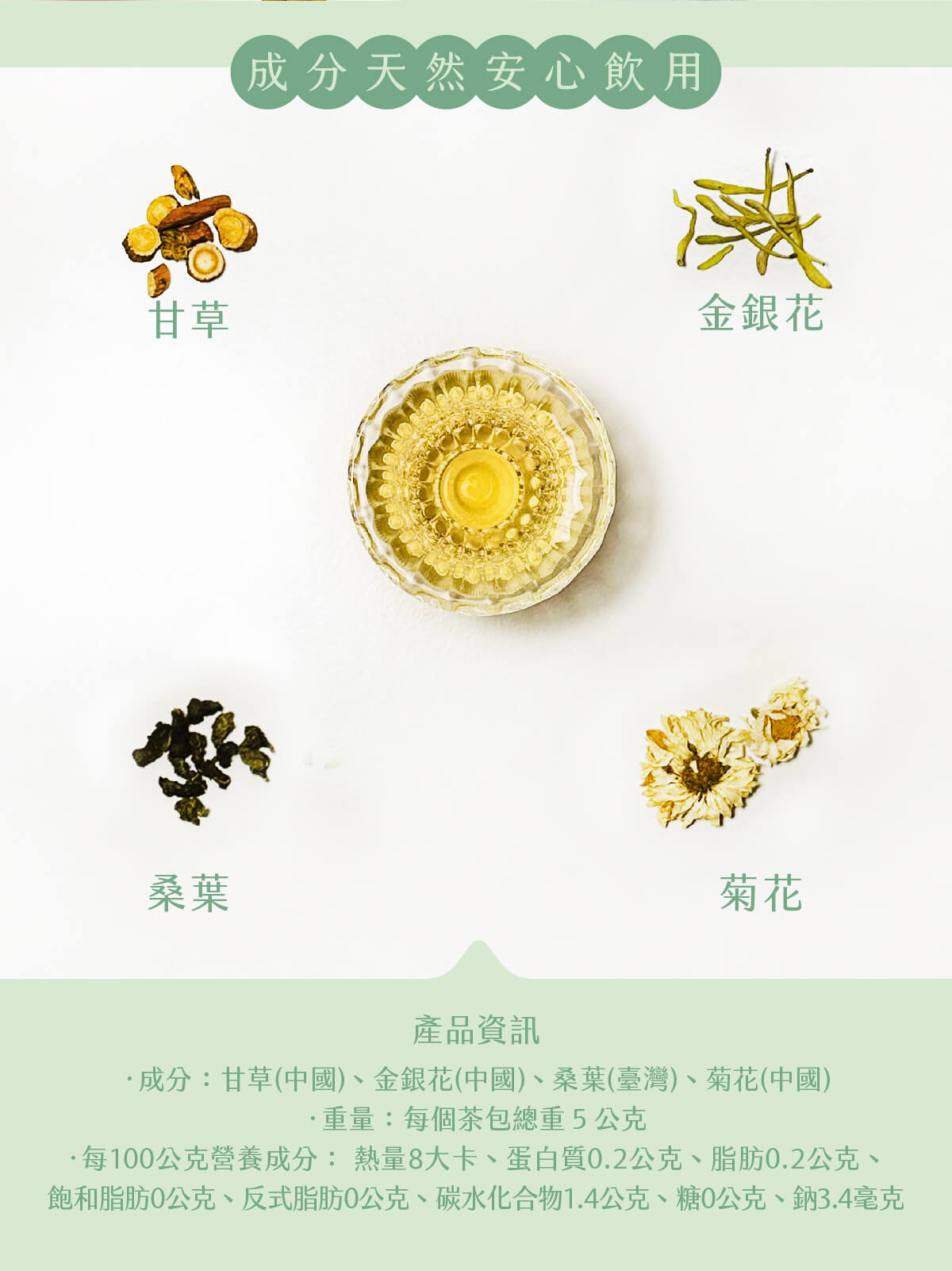 ‧成分:甘草(中國)、金銀花(中國)、桑葉(臺灣)、菊花(中國)
