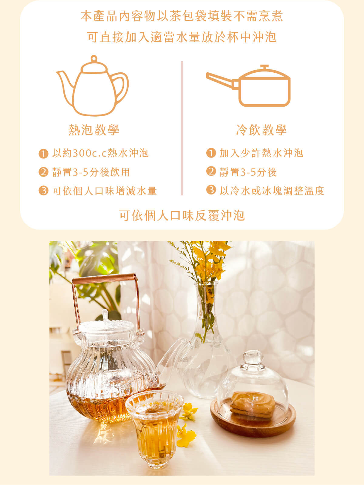‧本產品內容物以茶包袋填裝,不需烹煮,可直接加入適當水量放於杯中沖泡。