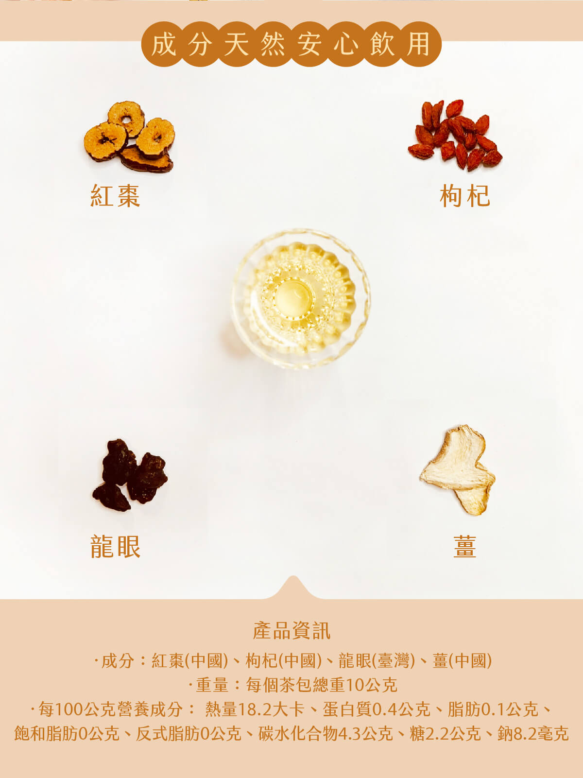 ‧成分:紅棗(中國)、枸杞(中國)、龍眼(臺灣)、薑(中國)