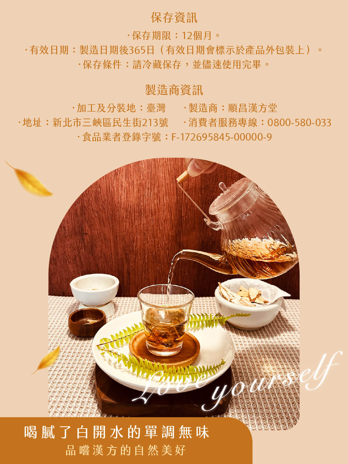 服務時間:10:00-21:00 客服電話:0800-580-033 客服信箱:sclifeherb@gmail.com 粉絲專頁:順昌漢方堂