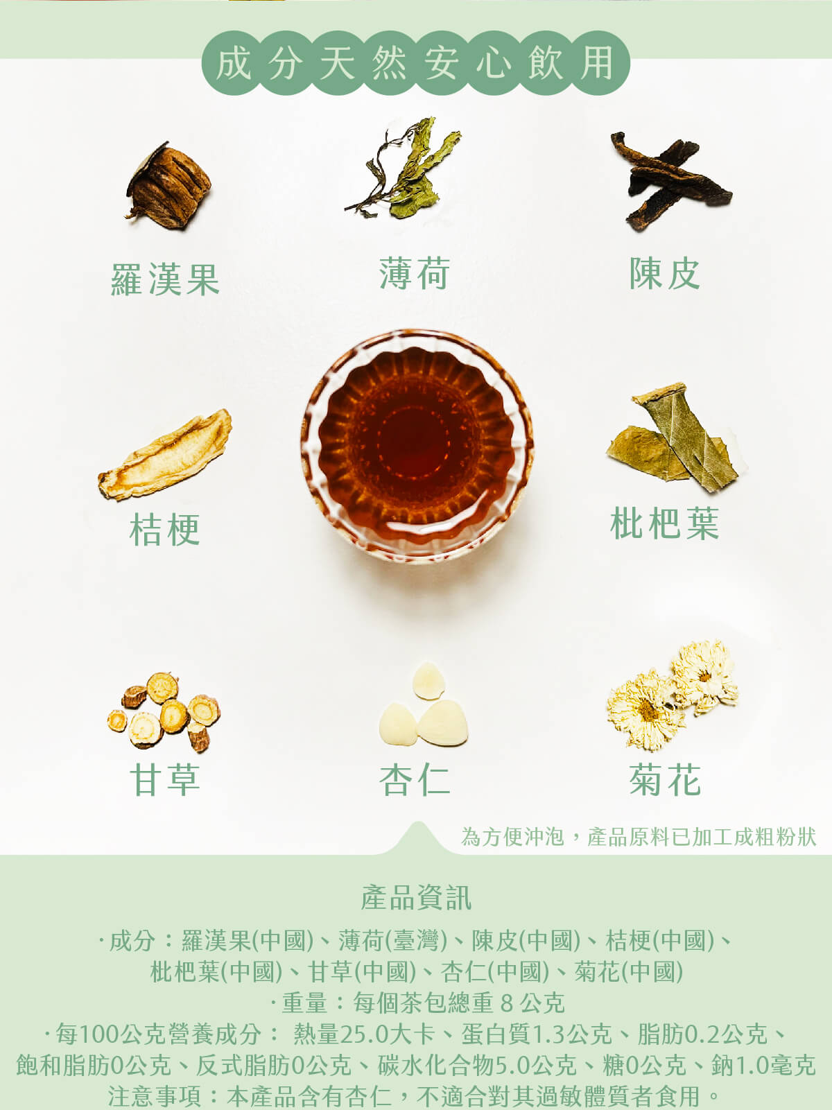 ‧成分:羅漢果(中國)、薄荷(臺灣)、陳皮(中國)、桔梗(中國)、枇杷葉(中國)、甘草(中國)、杏仁(中國)、菊花(中國)