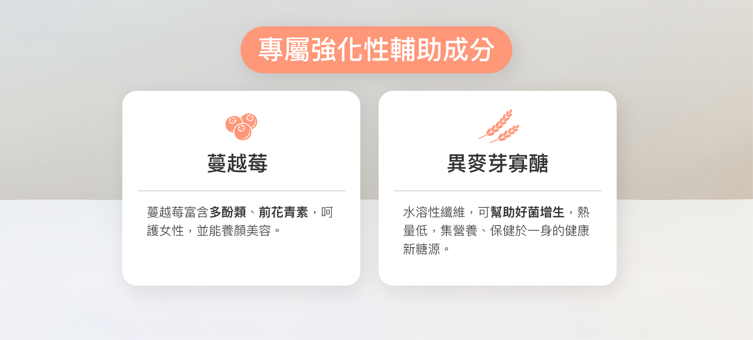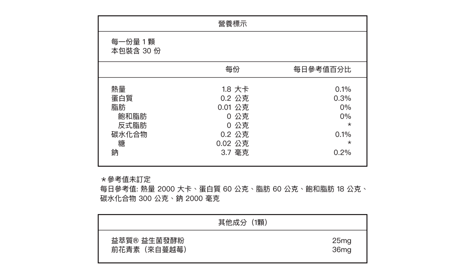 玉米澱粉、麥芽糊精、異麥芽寡醣、蔓越莓萃取物、益萃質®益生菌發酵粉、二氧化矽