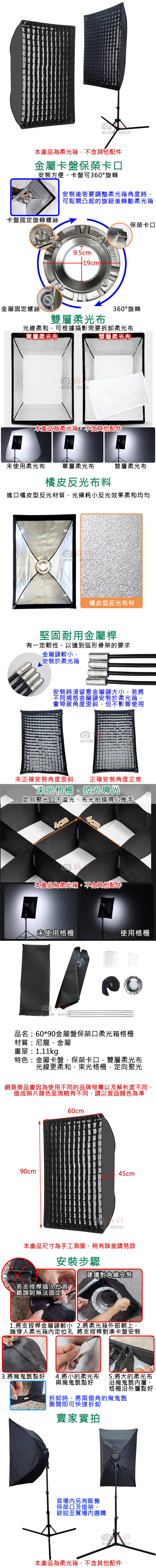 配件:柔光箱主體、柔光布*2、格柵網、支撐桿*4、金屬卡盤、收納袋