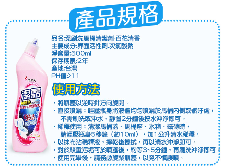 ►2分鐘瞬效潔白,輕鬆除垢免刷洗 ►99.9%除菌更安心 ►附著力佳有效分解髒污除垢 ►獨家彎頭設計,深入除垢無死角 ►時尚曲線瓶設計,輕鬆握拿更順手 ●產品代號:JB3091PXF ●主要成分:界面活性劑、次氯酸鈉 ●規格:500ml ●原產地:台灣 ●保存期限:2年 以上商品名稱、外包裝、圖片、敘述、規格、活動,若與原廠所述不符,請以原廠所述為主 一經拆封,除商品本身有瑕疵,恕無法辦理退貨。 因拍攝及不同螢幕產生色差,圖片僅供參考。顏色請以實際收到商品為準。 ★本公司保留接受訂單出貨與否的權利★