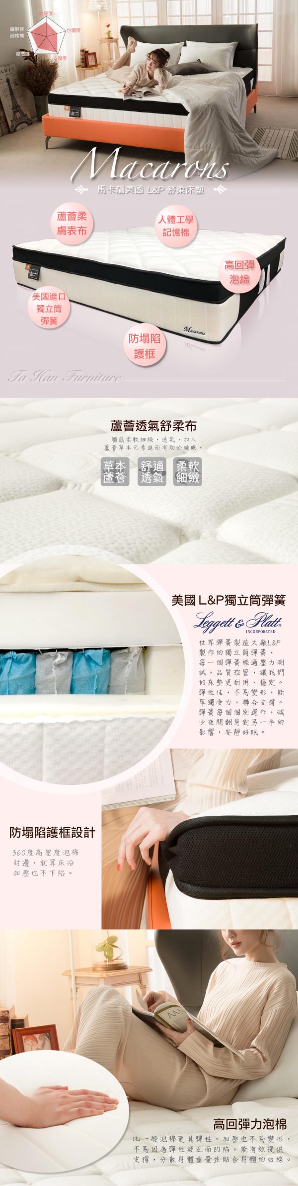 表布觸感柔軟細緻、透氣,加入蘆薈草本元素進而有助於睡眠 L&P製作的獨立筒彈簧,每一個彈簧經過壓力測試,品質控管,更耐用、穩定 360%高密度泡棉封邊,就算床沿加壓也不下陷 高回彈泡棉比一般泡棉更具有彈性,加壓也不易變形,回彈性更佳