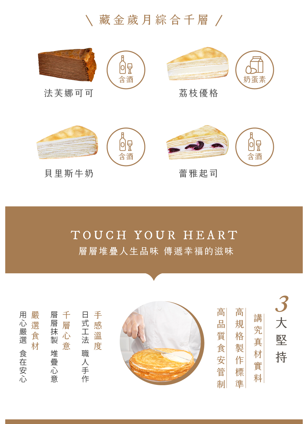 藏金歲月綜合千層:法芙娜可可+荔枝優格+貝里斯牛奶+蕾雅起司 【葷食】