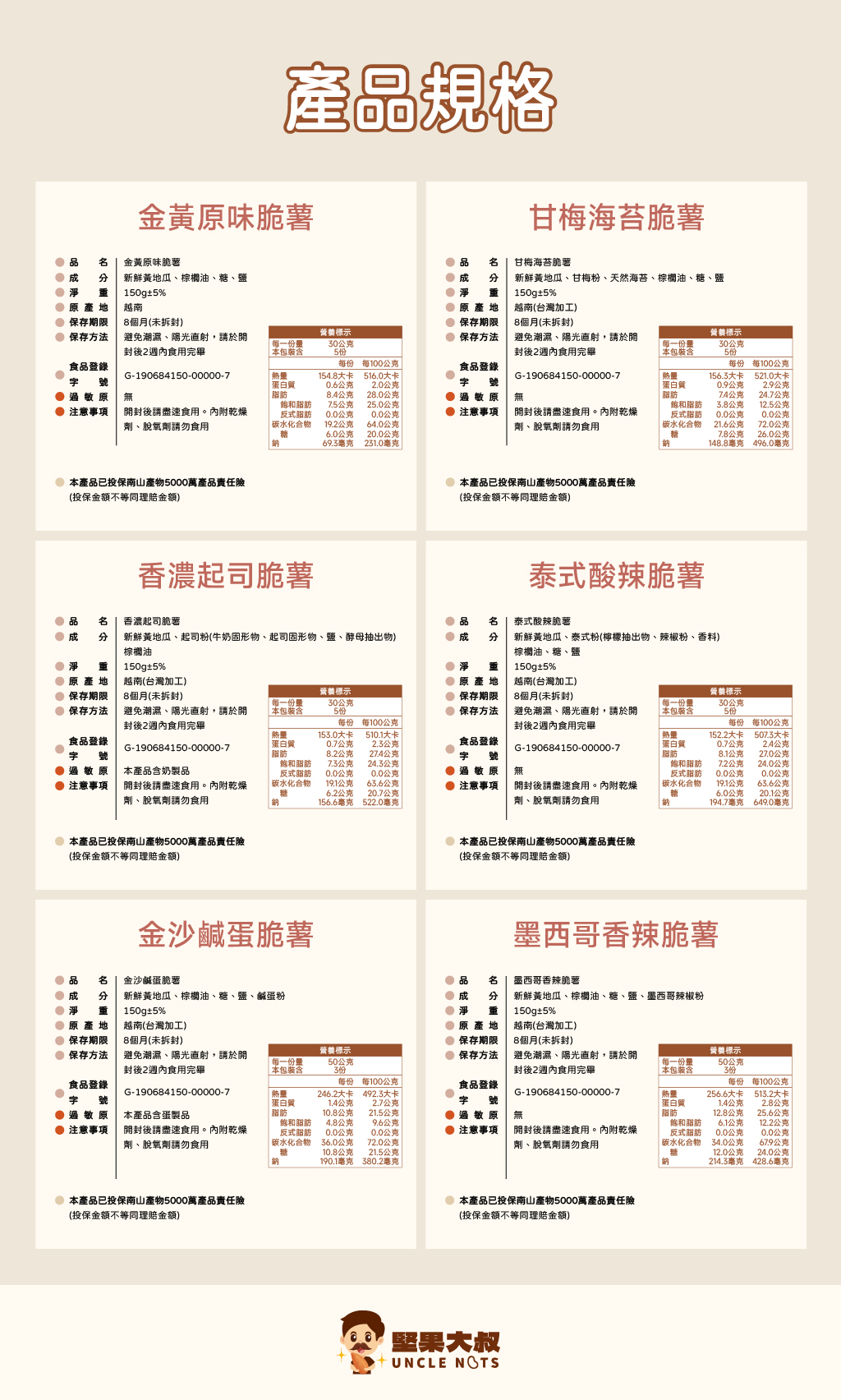 本組合含以下各口味1包 金黃原味/甘梅海苔/泰式酸辣 墨西哥香辣/香濃起司/金沙鹹蛋 ✓ 新鮮地瓜製作吃的到地瓜天然香氣 ✓ 全新口感地瓜薯條, 打造多層次食感 ✓ 爽脆口感喀滋喀滋, 一口接一口 ✓ 夾鏈袋設計, 可密封保持薯條新鮮度 ✓ 無添加防腐劑及化學添加物 ✓ 每種口味都好吃 ✓ 低溫真空工法製作, 非高溫油炸 每包 150公克 保存期限:8個月(未開封狀態) 堅果大叔安心保證 已投保南山產物5000萬產品責任險 SGS各項農藥殘留、黃麴毒素等未檢出