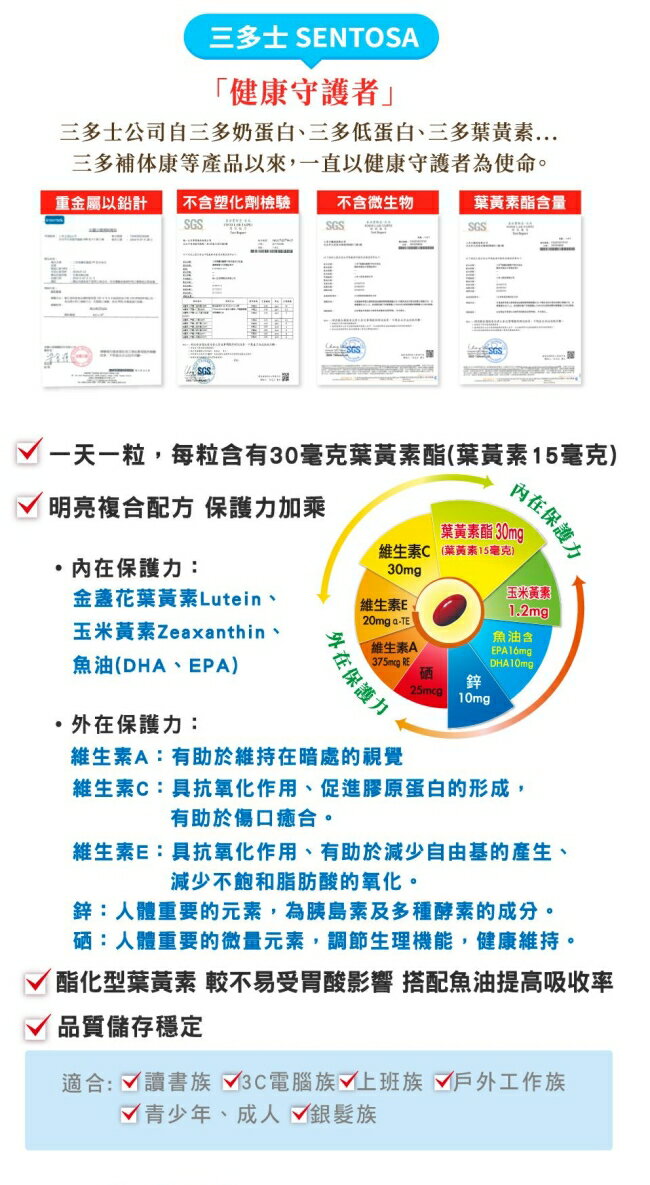 每粒含葉黃素酯30毫克。特別添加維生素A 、維生素C、維生素E、鋅、硒、魚油(含EPA、