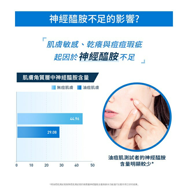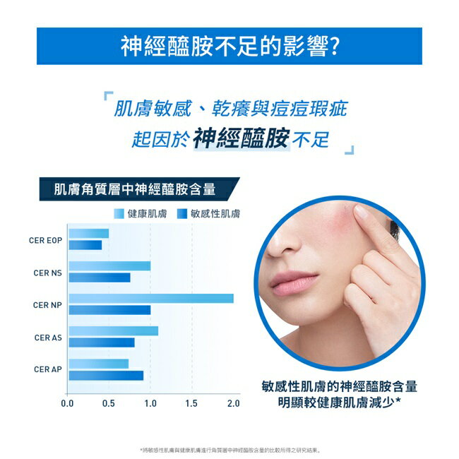 肌膚敏感、乾癢與痘痘瑕疵,起因於神經醯胺不足,敏感性肌膚的神經醯胺含量明顯較健康肌膚減少