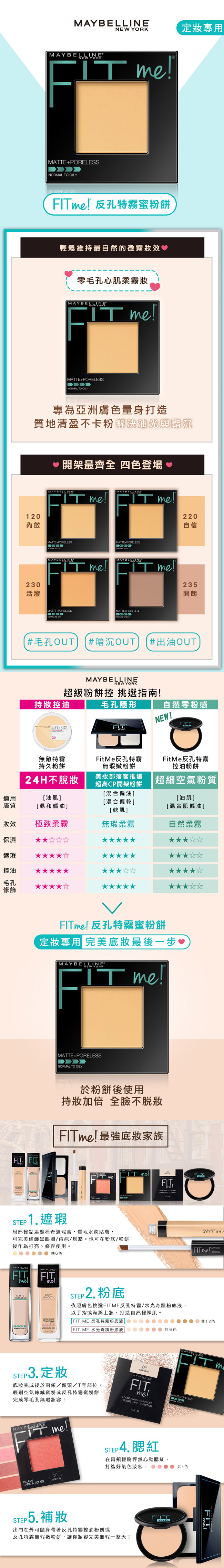 【FIT ME反孔特霧蜜粉餅】擁有獨特Blurring Micro-powders* 柔焦控油微霧粉體,其細緻的粉末不僅能有效修飾毛孔,也能吸附多餘皮脂,打擊油光!媚比琳更一口氣引進四個最適合台灣消費者肌膚的蜜粉餅顏色,開架色系最齊全,搭配使用【FIT ME反孔特霧粉底液】,簡單達成一加一大於二的持妝效果,完美定妝,上妝12小時,下午也不會暗沉,依然呈現肌膚最自然的柔霧零毛孔妝感!時尚包裝內含鏡子及海綿,上妝、補妝都超方便!