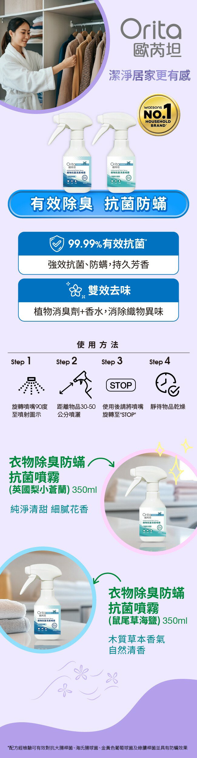 7. 歐芮坦衣物除臭防蟎抗菌噴霧 350ml - 英國梨小蒼蘭