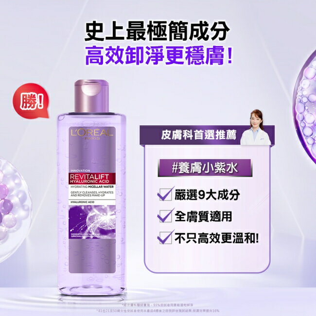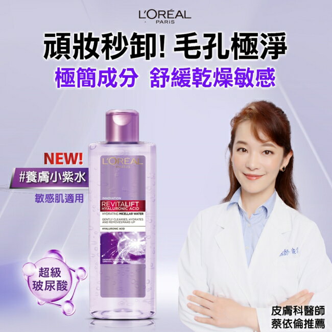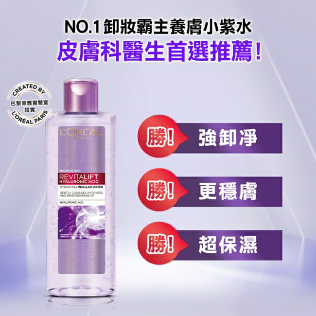 商品簡述 巴黎萊雅 全新超級玻尿酸潔顏水 卸妝加養膚!一抹卸淨!
